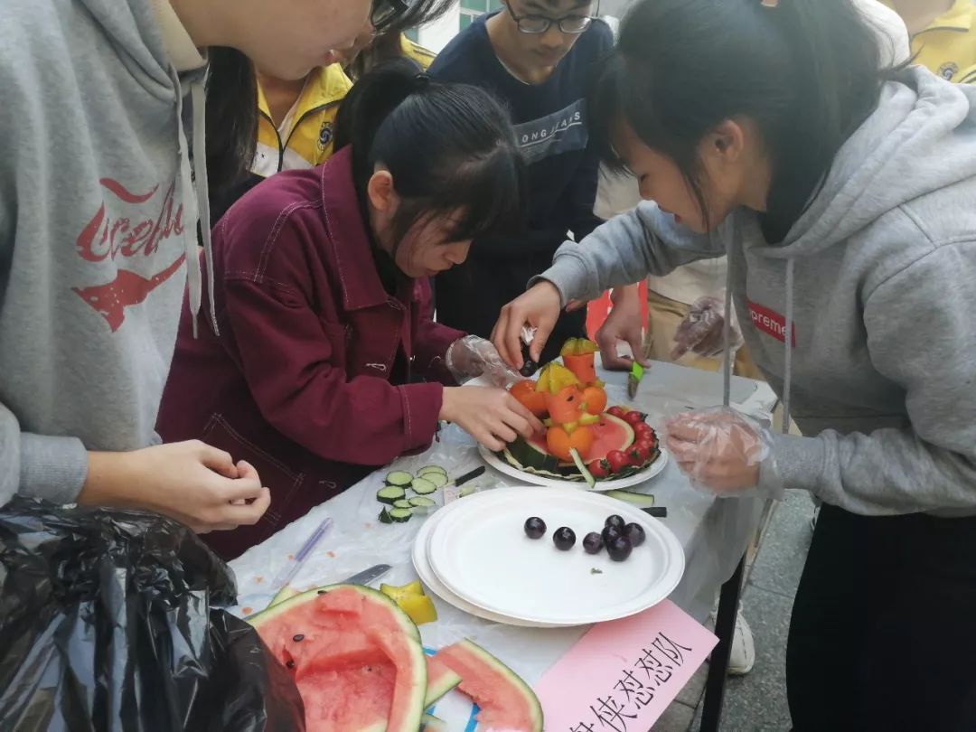 一等奖:美少女战队,她们想通过果盘表达自己对资助政策和学校德学思想的感恩,因为有了这些,让同学们更好的发出自己的星星之光。同时也祝祖国更加美好繁荣。