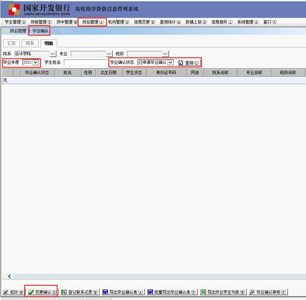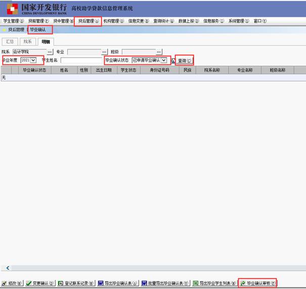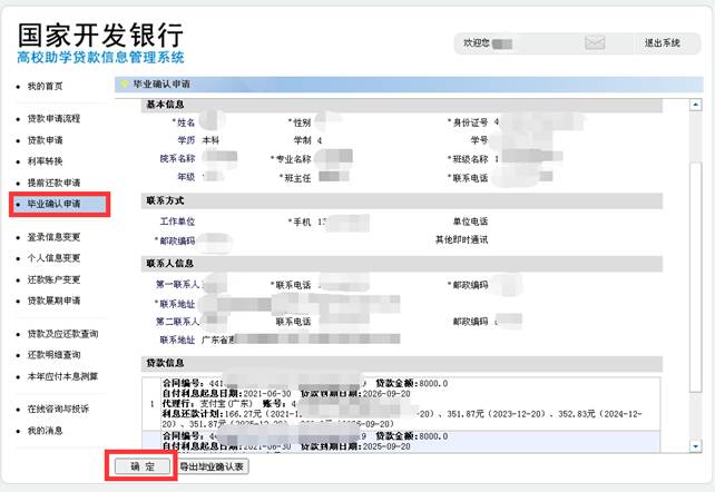 第四步骤:导出毕业确认表。学院完成高校助学贷款毕业确认审核及学生资助管理中心完成生源地助学贷款毕业确认审核后,学生资助管理中心导出高校和生源地助学贷款毕业确认表返回学院。