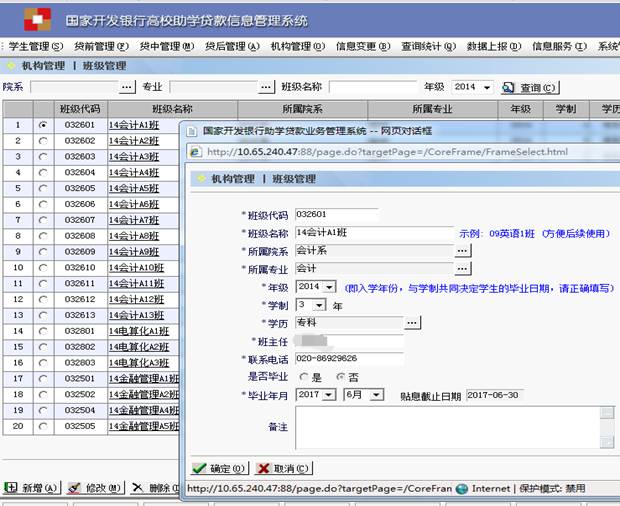 第一步骤:变更班级管理信息。辅导员有更换的,要变更辅导员,登录高校助学贷款系统——机构管理——班级管理——选择年级如“2018”查询——点击左下角“修改”——在“班主任”中变更最新的辅导员(填写现在辅导员名字)——在“联系电话”中变更最新联系电话——确定,变更确认操作如下图3: