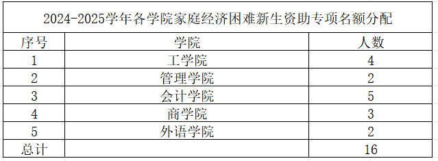 根据前期调研摸排各学院的困难学生实际情况,工学院等五个学院具有符合专项资助条件的新生,现根据相关学院新生的人数比例分配如下: