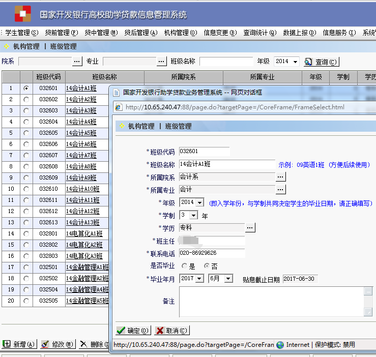 第一步骤:变更班级管理信息。辅导员有更换的,要变更辅导员,登录系统——机构管理——班级管理——选择年级如“2016”查询——点击左下角“修改”——在“班主任”中变更最新的辅导员(填写现在辅导员名字)——在“联系电话”中变更最新联系电话——确定,变更确认操作如下图3: