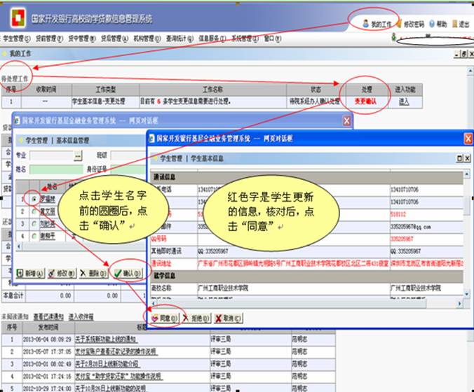 第二步骤:“变更确认”。登录系统后在“我的工作”界面上会出现待处理的工作,点击“变更确认”——进入审核页面,单个点击学生姓名前面的圆点——点击“确认”——进入学生信息更新页面,核对信息后点击“同意”,变更确认操作如下图4: