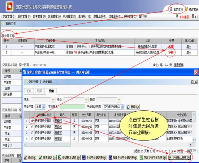 具体要办理的学生名单可以在国开行系统“贷后管理”——“毕业确认”——“毕业确认状态”选择“未申请毕业确认”进行查询。