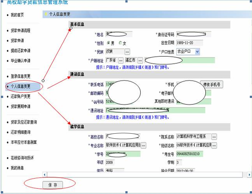 第一步骤:“个人信息变更”。进入“个人信息变更”——核对、更新信息:基本信息、就学信息(已就业的同学要填上就业信息)、通讯信息(请勿填写学校地址,需更新为最新地址)、家庭信息——更新信息后点击左下角“保存”,操作如下图1: