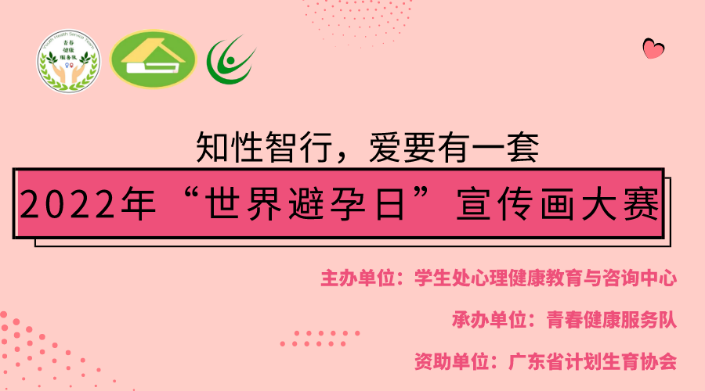 《中国公民健康素养66条基本知识与技能(2015年版)》指出:公民应当“选择安全、高效的避孕措施,减少人工流产,关爱妇女生殖健康。”为进一步提高青少年安全避孕意识,普及避孕节育以及生殖健康知识,提高青少年知情选择率、减少非意愿妊娠的发生,ky开元将在2022年9月20日-28日举行“知性智行,爱要有一套”宣传画大赛,本次比赛由广东省计划生育协会资助,学生处心理健康教育与咨询中心主办,青春健康服务队承办。