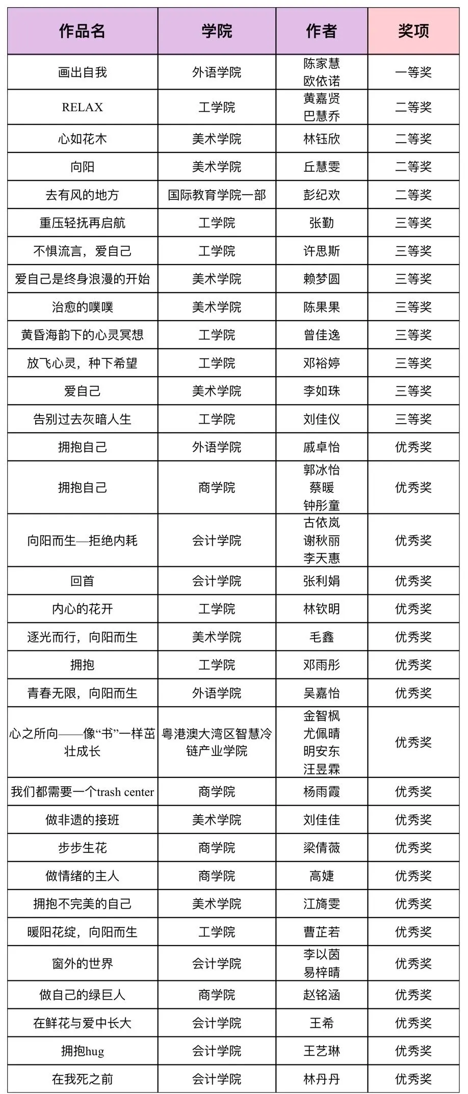 根据《广东省教育厅关于举办2024年“5·25”大学生心理健康月系列活动的通知》,本着公开、公正、公平的原则,本次系列活动之“随心所绘,以画抒心”心理绘画大赛共收到来自各个学院共39份作品(部分作品因原创性不足、绘制方法或绘制内容不符合要求等原因,未予以展示和进入投票环节),经线上网络投票和专业老师评选两个环节,共评出一等奖1名、二等奖4名、三等奖8名、以及优秀奖若干。让我们恭喜获奖的同学,接下来让我们一起看看获奖名单吧!