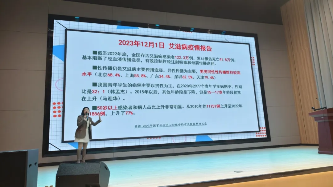 讲座伊始,曾华老师以其深厚的专业知识和丰富的经验,为学生们详细解读了中国各省份的艾滋病感染率数据,并通过艾滋病报告及数据向学生们揭示了艾滋病的传播途径。在讲座的讲授过程中,曾华老师融入了艾滋病知识问答的互动环节,学生们踊跃举手,现场气氛热烈。