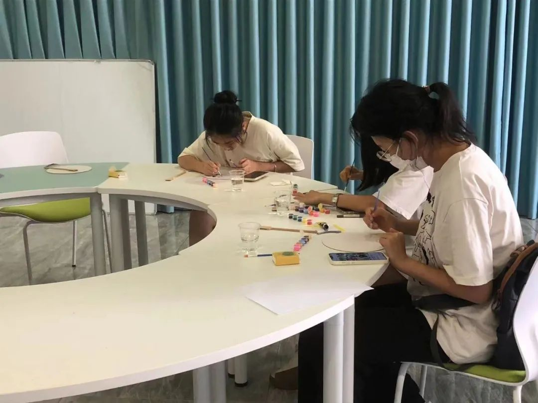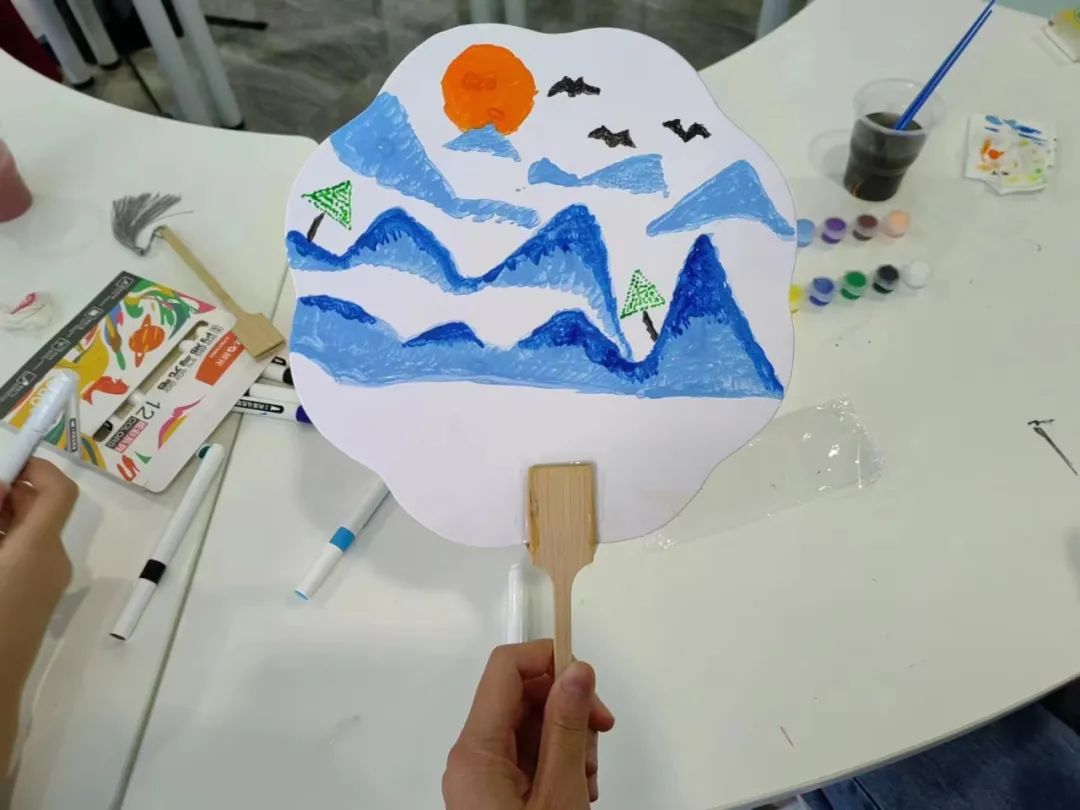 同学们在轻柔的音乐中,拿起画笔跟随教程在扇子上画出属于自己的天地,在绘画过程中通过自己的奇思妙想,一个个素白的扇面被点缀成灵动多彩、独一无二的精美作品。