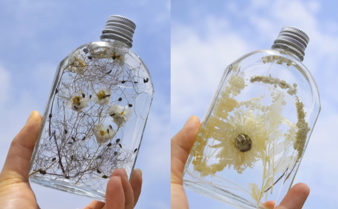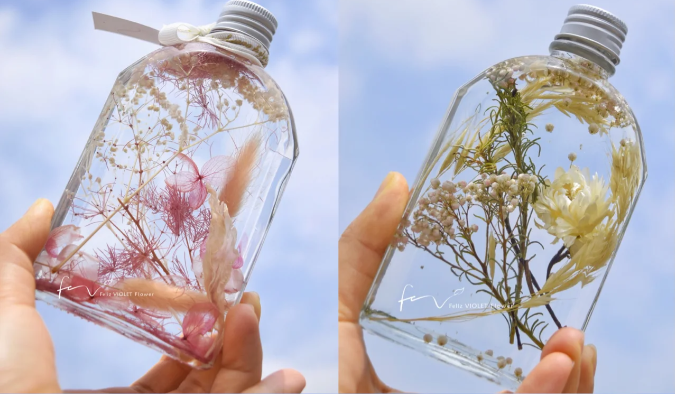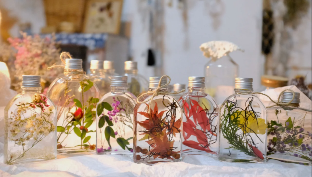 在浮游花瓶活动中,现场会提供不同的永生花材、玻璃瓶和无火香薰液,同学们可以组合搭配出属于自己的浮游花瓶。