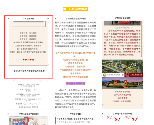 为深入学习贯彻习近平总书记给北京大学援鄂医疗队“90后”党员重要回信精神,积极响应全国网上交流“新媒体平台@大接龙”活动,推动形成大学习、大讨论、大实践的活动态势,省教育厅于4月20日公布《广东省学习贯彻总书记重要回信精神网上交流讨论“@大接龙”工作方案》,在广东省教育厅思政处指导下,广东高校网络思想政治工作中心、广东高校易班发展中心于4月23日至5月9日协调、联动广东156所高校开展回信精神大学习、大讨论、大实践,并根据片区划分发起高校接龙活动。
