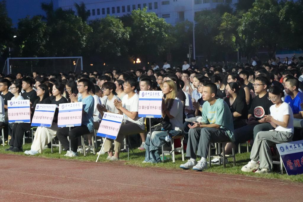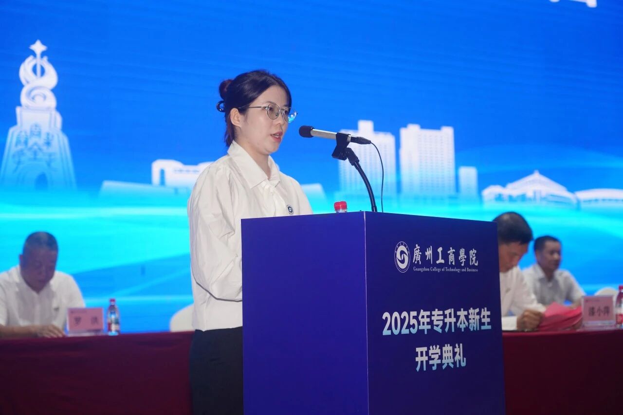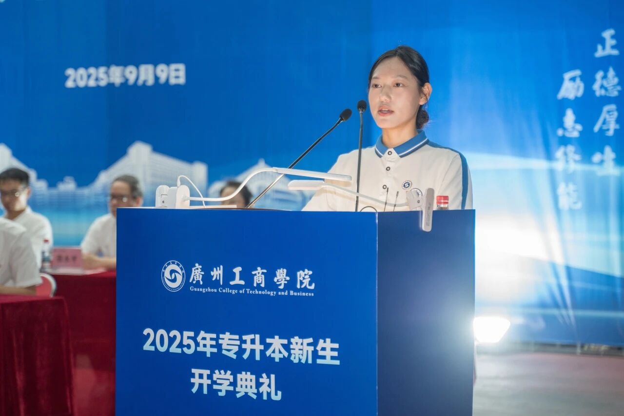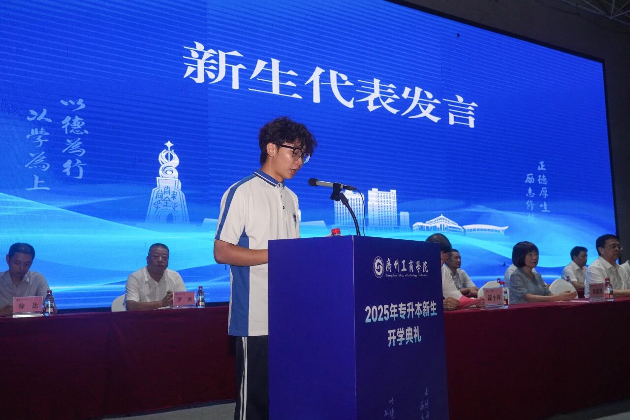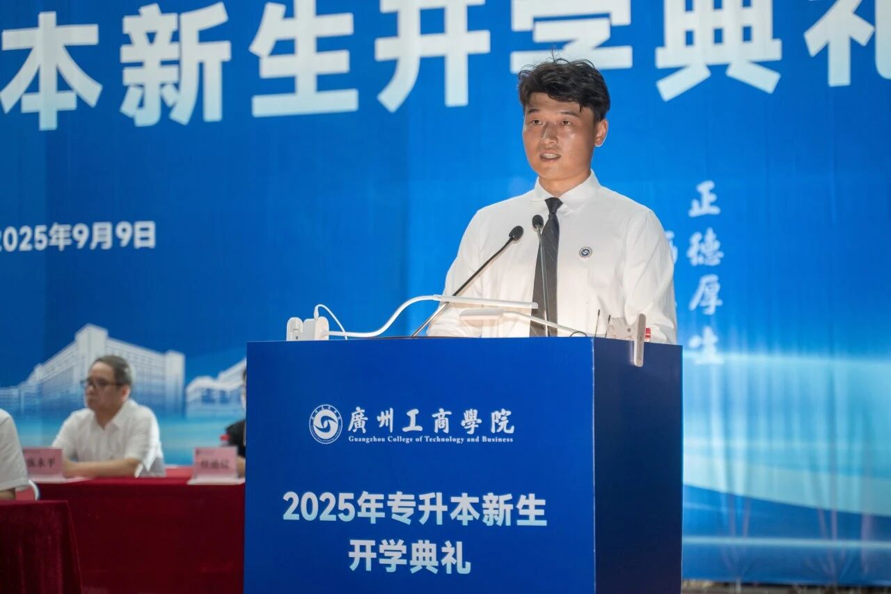 新生代表亦展现出昂扬向上的精神风貌。花都校区音乐学院钟竞乐同学回顾专升本备考岁月,倡议大家坚定理想、勤学笃行、敢于创新、友爱互助;三水校区会计学院贺俊熙同学则表示将以饱满热情投入专业学习,深耕理想、绽放光芒。