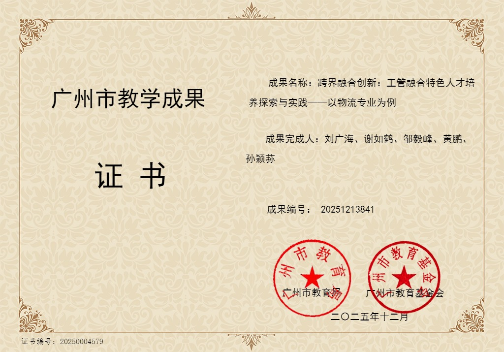 【本网讯】近日,ky开元收到2025年广州市教学成果荣誉证书。根据《广州市教育局广州市教育基金会关于公布2025年广州市教学成果遴选结果的通知》,广州大学和ky开元集团官网等合作成果《跨界融合创新:工管融合特色人才培养探索与实践——以物流专业为例》获广州市教学成果。