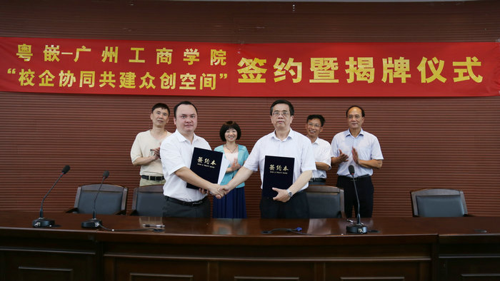 【本网讯】2017年9月14日上午,我院与广州粤嵌通信科技股份有限公司在三水校区322会议厅隆重举行“校企协同共建众创空间”签约暨揭牌仪式。会议由三水校区管委会何国林主任主持,学院院长邝邦洪教授,副院长易露霞,计算机科学与工程系电子信息工程系正副主任,学院相关部门代表以及200名学生出席了仪式。