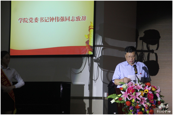 大赛伊始,全体起立奏唱《没有共产党就没有新中国》。伴随着热烈的掌声,学院党委书记钟伟强上台发表了热情洋溢的致辞,他指出:在“七•一”前夕,隆重举行“红心向党,唱响中国梦” ——庆祝中国共产党成立95周年暨红军长征胜利80周年合唱比赛,旨在在师生中弘扬爱国主义精神,回顾中华民族实现伟大复兴的百年奋斗历程,颂扬中国共产党的丰功伟绩,传承红军优良传统,唱好中国好歌曲、传播中国好声音、讲好中国好故事,唱响主旋律,营造好氛围。同时,他希望全体师生能以“合唱比赛”为契机,在比赛的感召下,把对“中国共产党的热爱、对人民军队的热爱、对远大理想的追求”融入到美妙的歌声中,凝心聚力,唱出激情、唱出力量、唱出团结、唱出干劲,以更加高昂的斗志,投身到“德学”“五进”和加快我院教育事业发展,创建高水平应用型大学的伟大实践中,努力开创我院各项工作的新局面。他衷心祝愿祖国繁荣昌盛,明天更加灿烂辉煌,同时也对学校以及师生们致以美好的祝福!