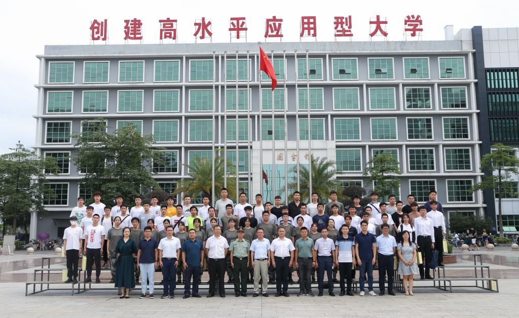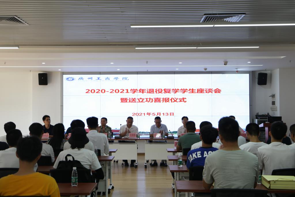 【本网讯】5月13日下午,ky开元集团官网和江门市蓬江区退役军人事务局、人武部共同举办的2020-2021学年退役复学学生座谈会暨送立功喜报仪式在学校三水校区举行。学校副校长朱特威,校长助理、学生处处长黄鹏,江门市蓬江区退役军人事务局副局长、党组成员肖国强,蓬江区人武部办公室潘伟,蓬江区环市街退役军人服务站刘鸿儒,蓬江区退役军人事务局邓树廉,学生处、教务处、保卫处、武装部工作人员,58名退役复学学生,相关辅导员及学生督察队代表参加座谈交流。