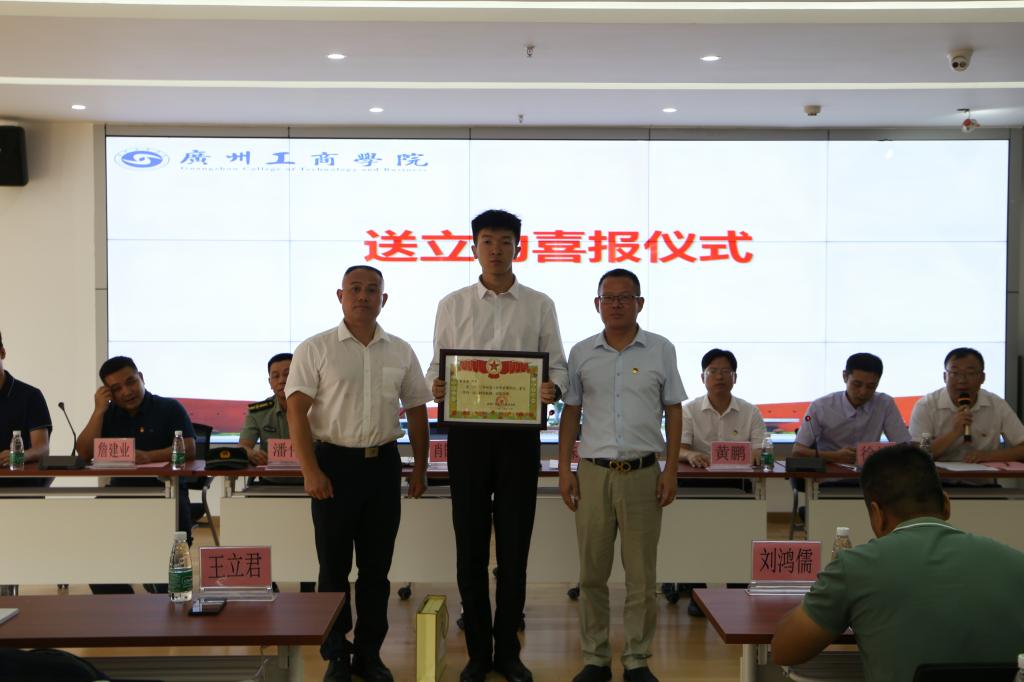 三水管委会常务副主任、学生处副处长徐达宣读来自武警广东省总队机动支队下发的嘉奖令——王立君同志在2020年度工作中表现突出,荣立三等功一次。接着,学校朱特威副校长、江门市蓬江区退役军人事务局党组成员肖国强副局长为2020级国际经济与贸易B5班的王立君同学颁发荣誉证书和礼品。