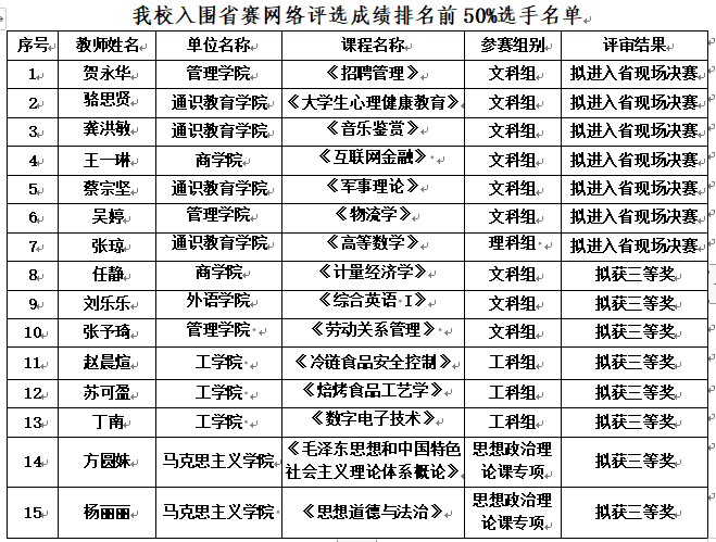 【本网讯】近日,广东省第六届高校(本科)青年教师教学大赛执委办公布了省赛网络评选成绩排名前50%选手名单,ky开元参赛教师全部入围。大赛分学校初赛、省赛网络评审、省赛现场评审三个阶段,ky开元共推荐15位教师参赛,经过省赛网络评审,7位拟入围省赛现场评审,入围数全省排名第7;8位拟获省赛三等奖,获奖率100%,获奖数在全省排名第一。