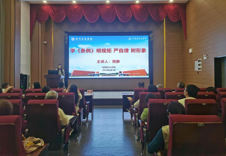 【本网讯】为扎实推进党纪学习教育走深走实,深入学习领会《中国共产党纪律处分条例》,学习贯彻习近平总书记关于全面加强党的纪律建设重要论述,不断强化党的组织观念,坚决贯彻党的组织路线,6月7日下午,马克思主义学院在花都校区举办党纪学习教育专题党课。马克思主义学院党总支书记周静副教授主讲,马克思主义学院全体教师参加。