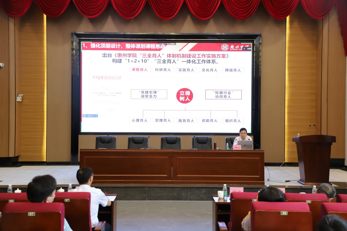 【本网讯】为开阔教师教育教学视野,更新教师教育教学理念,帮助教师更加快速成长,6月9日,学校邀请惠州学院副校长、华南师范大学博士生导师郑文教授在花都校区图书馆414学术报告厅作“立德树人打造‘惠院’特色的课程思政教育体系”专题讲座。校长王日华主持,学校党委书记张振超、副校长朱特威同志出席,各教学单位正副职、专业负责人、教研室主任,教务处、人事处、学生处、党委办公室、宣传部、教师教学发展中心、质量监控与评估中心副职及以上负责人,新(青年)教师教学能力提升培训班学员,有意申报2022年校级教学类项目的教师等172人到场学习。