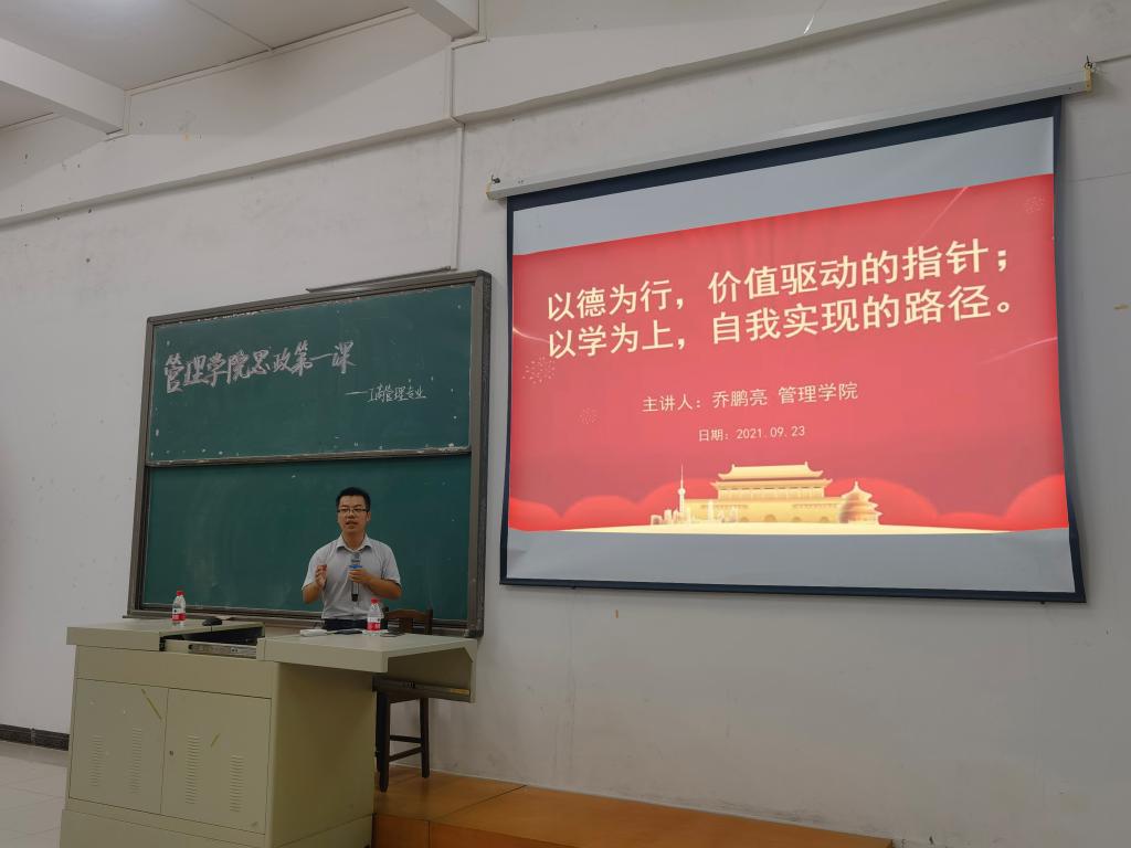 【本网讯】为深入贯彻《ky开元集团官网2021年秋季学期高校党委书记、校长和院党组织书记、院长上第一堂思想政治理论课活动方案》通知精神,加强对2021级新生的党史学习教育与培养,引导广大新生积极践行“德学·五进”教育实践活动,管理学院于9月23日在第一教学楼和第二实验楼开展思政第一课活动。主讲人为管理学院党总支书记、院长乔鹏亮和常务副书记、副院长邹剑峰。