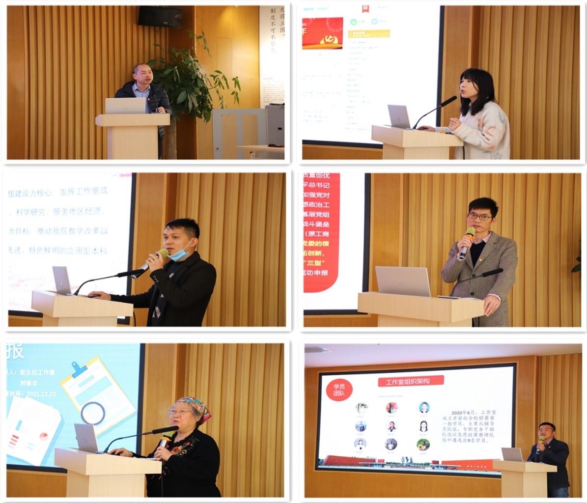会上,各工作室及项目负责人依次介绍专项工作的经验与成果,存在问题及下步工作计划。省级骨干辅导员工作室负责人王伟江介绍“德学五进”辅导员工作室基于两中心一平台(德育研究中心、德学教育中心、易班平台),以丰富的校园文化活动引领学生成长成才,借校内外专业平台资源,引领辅导员共同进步。“德学·五进”网络工作室负责人耿晓雯介绍依托于易班发展中心,以应用型“德学五进”特色文化为抓手,以学生网络文化社团为建设主体,凝聚学校网络思政工作的内在合力。省级“双带头人”教师党支部书记工作室负责人洪晓彬介绍工学院教师第一党支部以“用心教书、潜心育人、倾心课堂、专心研究、静心修身、真心奉献”的六心为原则,充分发挥教师党支部在教学质量、人才培养、科学研究、服务地区经济和文化传承与创新等方面的作用。省级党建工作样板支部负责人赵小锋就管理学院学生第一支部开展“样板支部”工作场所建设及完善、制度的建立和完善、党员教育管理、支部组织生活的开展等进行了系统介绍。班主任工作室负责人时临云指出班主任工作要牢固树立“学生中心”理念,顺应新时代大学生的特点创新工作内容、方法和载体,增强对学校的归属感与自豪感。张辉名师工作室主持人助理卢剑锋介绍工作室通过开展经常性的科学研究、专项培训、实践教学、经验交流、成果汇编等加强工作队伍建设,破解学校党建和思政队伍建设之惑,努力打造成为推动学校高质量发展的筑梦人团队。