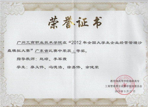 5月25日至27日,我院工商管理系学生参加“2012年全国高职高专大学生企业经营管理沙盘模拟大赛”广东省选拔赛,获得三等奖,指导老师赵琼、李军霞获得“优秀指导老师”称号。