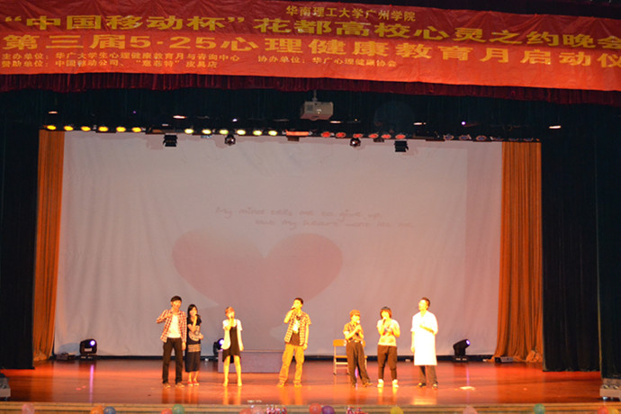 4月22日,我院心理健康协会一行七十人赴华南理工大学广州学院参加“花都高校心灵之约晚会”。晚会上,华广、培正学院、市政学院、行政学院、广二师等六所高校心理健康协会纷纷献上精彩的表演,我院心理情景剧《关爱心灵》更是赢得了阵阵掌声。