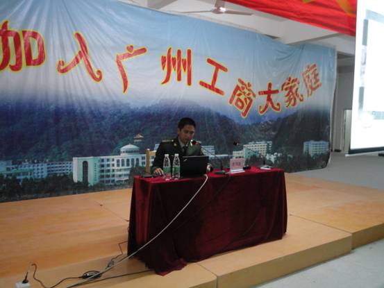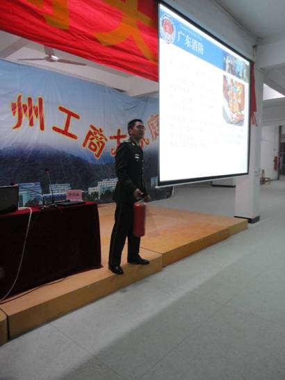 校园网讯 记者刘晓欣 摄影吴伟超 2010 年 12 月 28日,广州工商技术职业学院三水校区的学生在学生活动中心场进行了消防安全知识的专题讲座,特邀广州市公安消防支队,花都中队黄国波指导员主讲。此次讲座着重介绍了生活中火灾、水灾等事故的预防及事后处理的方法和遇到火灾时的自救方法。