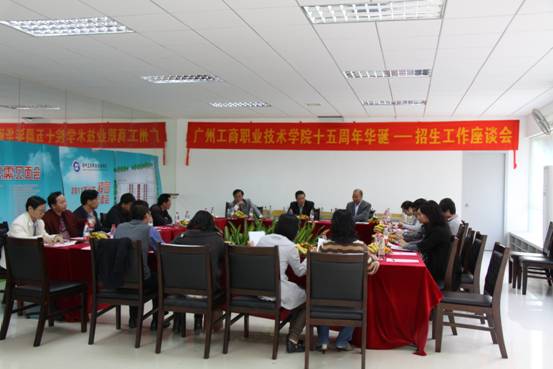 校园网讯 记者萧敏芳 邱庚源 2010年12月8日下午四点钟,广州工商技术学院15周年校庆之招生工作座谈会在体育馆二楼拉开帷幕。本次座谈会由招生办陈礼富主任主持,党委书记钟伟强和副院长苻坚莅临,并有幸邀请到一直支持我院招生工作的部分招办主任、中学校长及老师。