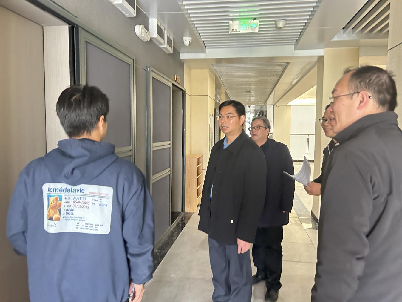 为推进“一站式”学生社区建设,打造平安学生社区,强化学生公寓的安全管理效能,深化学生的安全防范意识,有效遏制各类安全事故的发生,12月25日下午,学校党委副书记、校长王日华带队深入三水校区第四综合楼开展宿舍安全专项检查。工学院院长张永平,副院长欧仕益,党委副书记、副院长罗俊陪同。