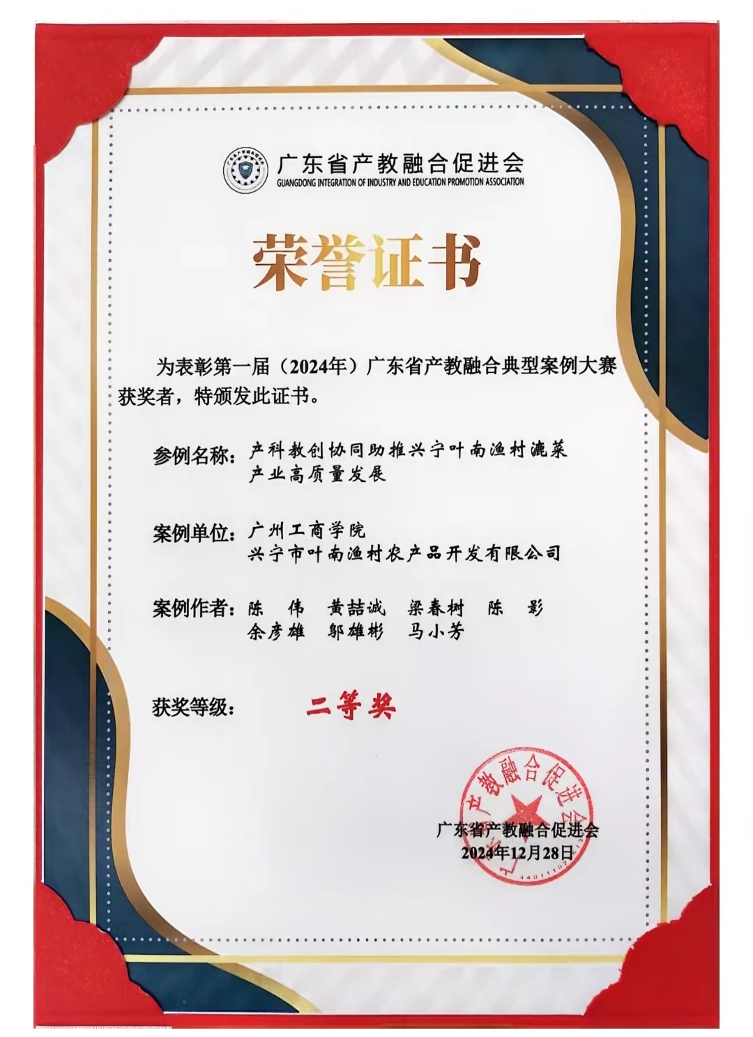 大会进行了第一届产教融合典型案例比赛颁奖仪式,ky开元集团官网管理学院陈伟团队申报的案例“产科教创助推兴宁叶南渔村漉菜产业高质量发展”荣获二等奖,并入选《广东省产教融合典型案例汇编(2024版)》。据悉,第一届(2024年)广东省产教融合典型案例大赛共收到全省近500份参赛案例,经初赛评选后有74项案例晋级决赛。决赛以校企现场答辩的方式分别决出一、二、三等奖。陈伟团队参赛的产教融合案例,进入了全部500份初赛参赛案例的前10%,连闯初赛和决赛两道“关卡”荣获二等奖。