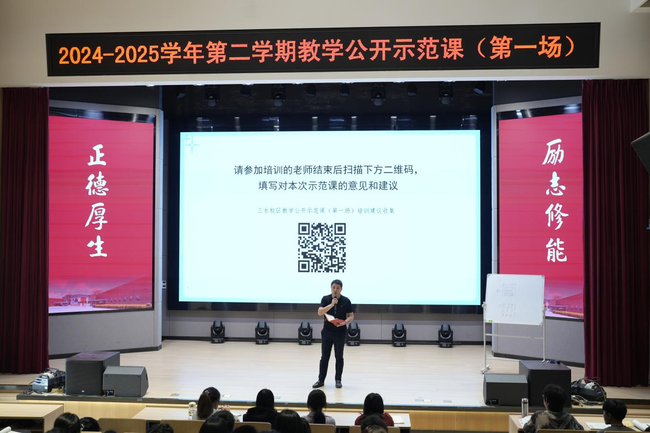 课堂教学是人才培养的主渠道和主阵地。为提升教师教学能力与课程建设质量,充分发挥课堂教学督查工作中优秀教师的示范引领作用,持续推广“德学引领 五进育人——民办高校思想政治教育的探索与实践”省级教学成果一等奖之“进课室”,4月17日下午,学校在三水校区第三综合楼707多功能礼堂开展本学期第一场教学公开课。活动由副校长易露霞教授主持,工学院王馨瑢老师主讲,校长助理易亚军教授作课堂指导,相关教学单位教学副院长(副主任)、专业负责人、教研室主任、专任教师代表、教务处、教师教学发展中心、质量监控与评估中心等共234位教师,56位学生代表参加。