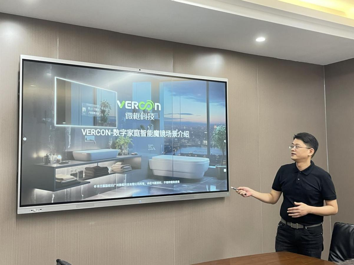 茶叙结束后,曾胜校友引领众人参观了微框科技的展厅,详细介绍了智能魔镜的多项功能,包括音乐视频播放、新闻资讯、实时天气、日历星座、路况信息留言、投屏、健康管理等功能,适用于家庭、酒店、公寓等各种卫浴场景。该产品采用了专业的镜面显示技术,将镜面与传感器和智能操作系统相结合,实现了镜面显示、交互和物联功能。