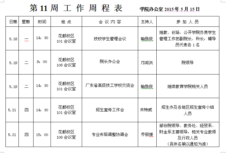 第 11 周 工 作 周 程 表