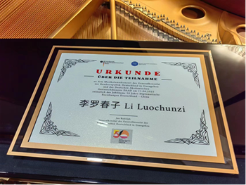 受德国驻华领事馆和德意志学术交流中心(DAAD)邀请,音乐学院李罗春子博士于6月11日出席参加了“中德建交50周年”系列特别庆祝音乐会,并在广州大剧院演奏了由李斯特作曲的钢琴独奏曲《钟声》。李罗春子博士还获得了由德意志驻华领事馆与德意志交流中心联名颁发的“中德建交50周年特别庆祝活动音乐家证书”。