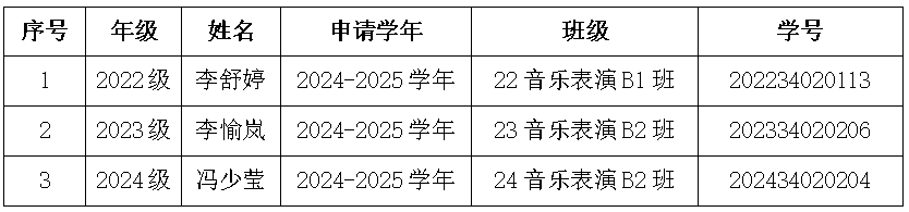 根据《关于做好新生奖学金获得者2024-2025学年考核及奖金发放工作的通知》的文件精神和要求,经学生申请、民主评议、音乐学院新生奖学金评审小组审核和学院党政联席小组评审,现将我院2022级、2023级和2024级新生奖学金初审名单公示如下。公示期间,任何对评审结果有异议者都可以通过来访或书信等形式向音乐学院学生工作办公室反映公示对象的问题,反映者要用真实姓名,并提供联系方式,匿名则不予受理,以示负责。