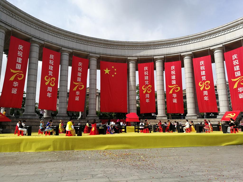 6月29日,新华街道在花都区区府广场举办了庆祝中国共产党成立98年、新中国成立70年快闪活动。活动当天骄阳似火,学生们身穿厚重的演出服在烈日下演出了2个多小时。但他们都表示能够参与这样的大型演出活动机会非常难得,而且是建党98周年的献礼活动,意义非凡。活动结束后,新华街文体中心的负责领导对我系学生给予了高度好评。
