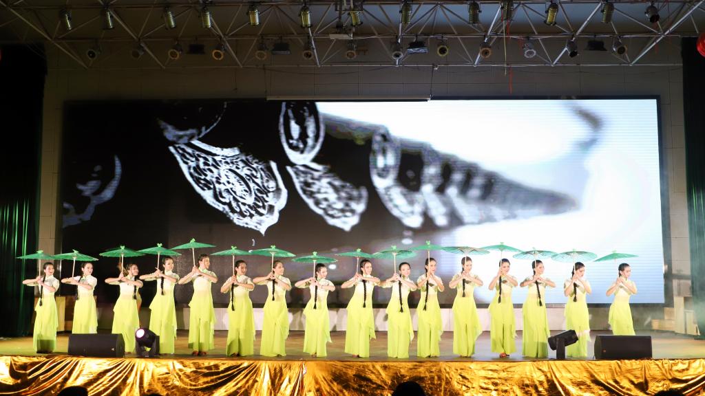 激动人心的乐音刚刚停下,一群身着淡青色衣裳的岭南女子在舞台上款款走来。女子群舞《雨打芭蕉》向在场观众展现了岭南舞蹈的柔美。