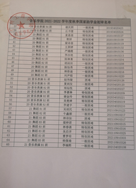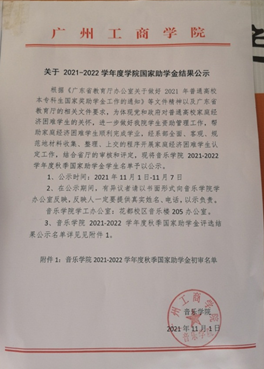 按照学院国家助学金评选工作安排,音乐学院学工办于2021年11月1日-11月7日将这个65名学生进行名单公示。截止到11月8日,结束公示。公示期间,无异议。