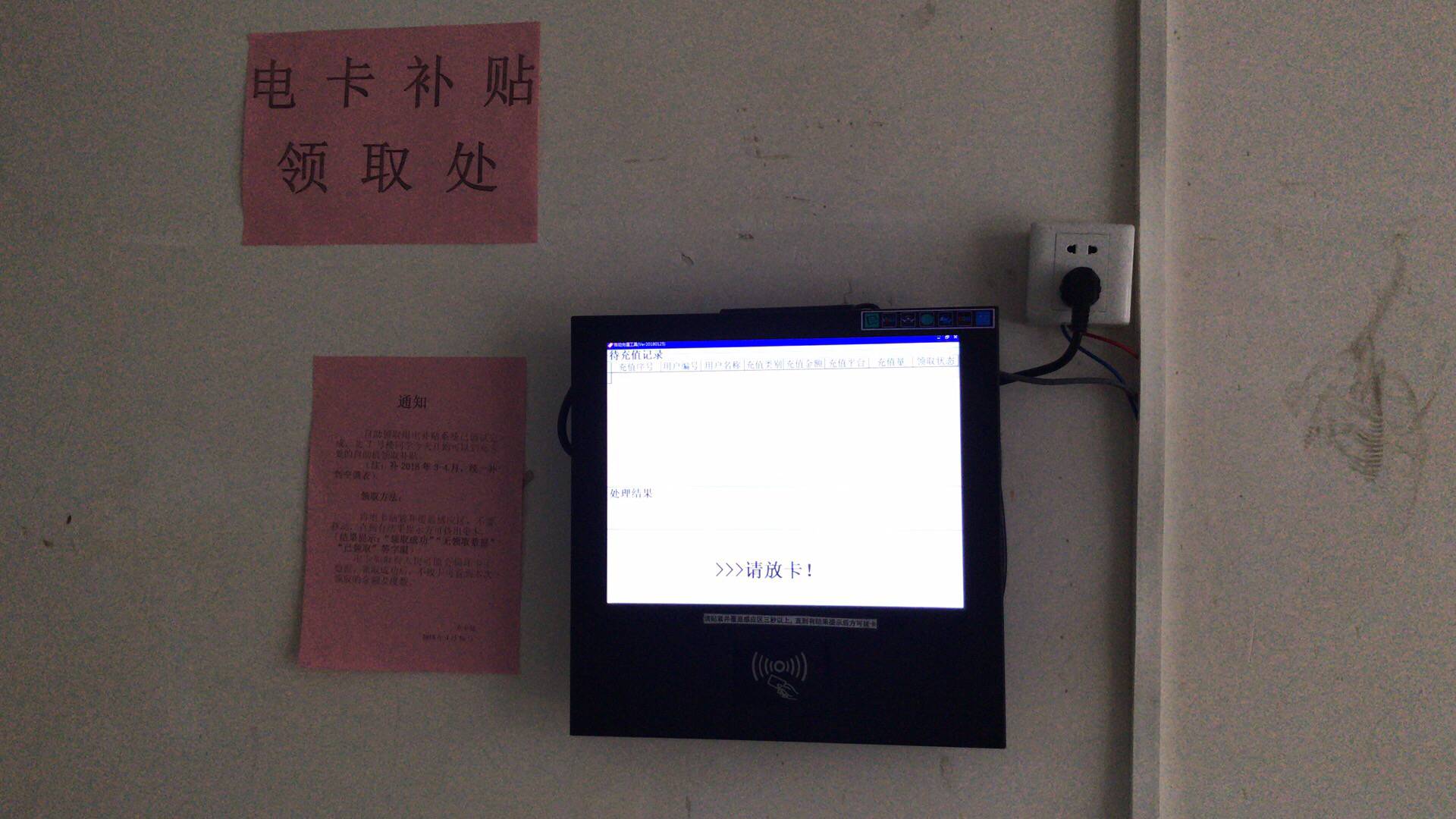 自助领取用电补贴系统已调试完成,请各宿舍到充卡处的自助机领取补贴(注:补2018年3-4月,统一补到空调表。领取成功后请及时刷上电表,方能再次充值)。