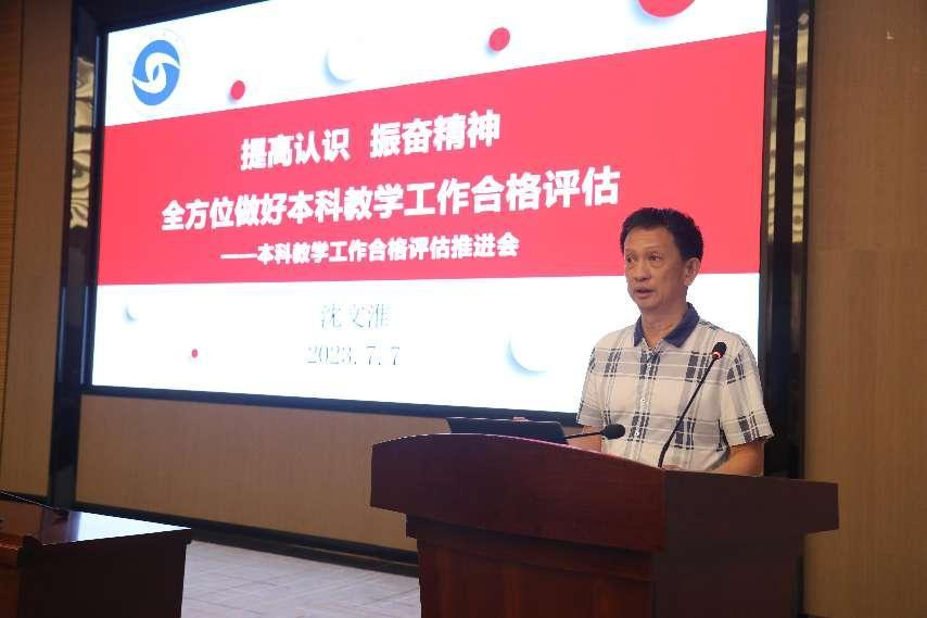 沈文淮副校长对本科教学工作合格评估进行了全方位部署。围绕评估制度、工作方案、工作任务、进程安排四个方面,他回顾了新时代中国特色的院校评估制度创新发展历程,“五位一体”评估体系,“4321”合格评估精髓要义;详细阐述了学校合格评估工作方案“1234”工作目标,机构组别和工作职责;细致说明了二级学院(部)工作任务,支撑材料收集和自评报告撰写要求;明确了合格评估工作整体进程安排和各职能部门、学院(部)近期工作重点。最后,沈校长还对教育部最近出台的《关于深化新时代高等学校评估改革方案》的总体要求与改革内容作了解读,为推进本科教学工作合格评估指明了方向。