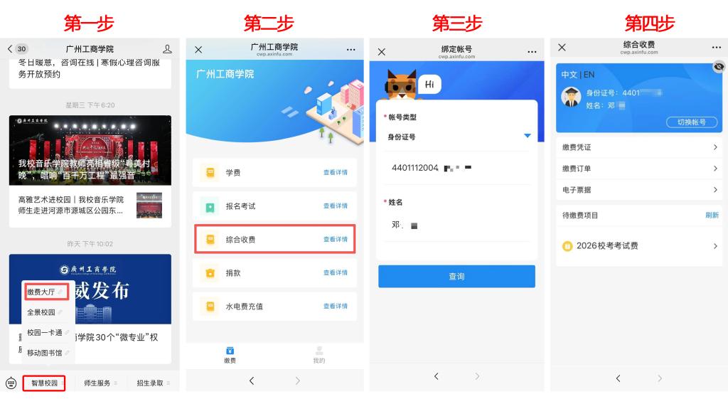 2.点击“智慧校园”→“缴费大厅”进入缴费主页,点击“综合收费”菜单,依次输入“身份证号码+姓名”,点击“查询”,在待缴费项目栏内看到目前该账号的待缴项目,再次点击进入,按系统每一步提示完成缴费。